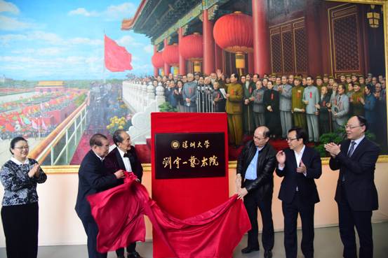 1月7日上午,在我校艺术村揭牌成立刘宇一艺术院,同时举办丹青华章筑国梦——刘宇一画展。全国政协委员、香港中华文化总会名誉会长刘宇一,全国政协教科文卫体委员会副主任张秋俭,中宣部原常务副部长、全国政协常委龚心瀚,中共广东省委宣传部常务副部长郑雁雄,深圳市委常委、宣传部部长李小甘,我校党委书记刘洪一、副书记范志刚,深圳市民政局局长廖运飞,深圳报业集团社长、党组书记陈寅,深圳出版发行集团公司党委书记、总经理尹昌龙,深圳市文体旅游局、深圳市新闻出版广电局、深圳市文物局副局长陈绍华,女高音歌唱家、声乐教育家郭淑珍,画家杨铭仪,雕塑家曹崇恩,导演丁萌楠,舞蹈家陈爱莲,作家魏明伦,香港太平绅士周振基,北京银谷艺术馆执行馆长杨京岛,书法家寒石等来自全国艺术界的知名画家、文化界、学术界的知名人士、企业界的行业名家以及我校职能部门主要负责人、师生代表和新闻媒体界的人士一道参加了刘宇一艺术院的成立仪式。范志刚主持了开幕式。