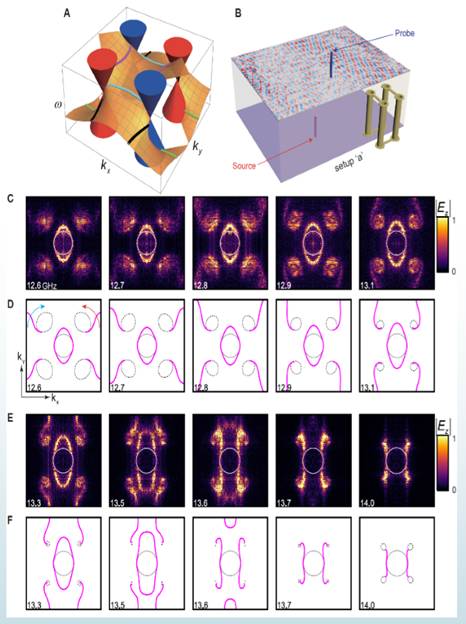 最近,英国伯明翰大学张霜教授课题组与深圳大学范滇元院士团队先进材料光子学课题组、University of Exeter和中科院物理合作,设计并制备了马鞍形状的光子晶体(图1A,B),观测到了理想的外尔系统,其中四个对称性保护的外尔点坐落在同一个频率,并且在这个频率周围没有其他能带干扰(图1C)。他们采用近场扫描的方法测量了该光子晶体的体态和表面态的分布情况(图2)。作为源的探针放在样品的底部,这样可以同时激发体态和表面态。测量的探针在样品的上表面扫描,可以得到近场的振幅和相位分布,然后通过傅里叶变换得到其动量空间的等频面分布情况。从图中的实验和仿真的对比中可以看到螺旋表面态的旋转情况。他们的发现对外尔拓扑态的研究提供了一个理想的平台。