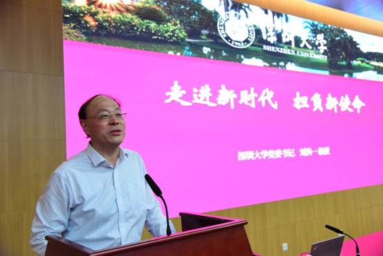 刘洪一首先阐释了中国和深圳大学面临的新时代、新矛盾。他指出,中国特色社会主义进入了新时代:经济建设取得了重大成就、日益走近国际政治舞台的中央、全面从严治党成效卓著、科技发展引人瞩目,等等。同时,新时代面临的主要矛盾也已经发生改变,已经转化为人民日益增长的美好生活需要和不平衡不充分的发展之间的矛盾。党的十九大把习近平新时代中国特色社会主义思想确立为我们党必须长期坚持的指导思想。这一新思想回答了一个重大的时代课题,即新时代坚持和发展什么样的中国特色社会主义、怎样坚持和发展中国特色社会主义。