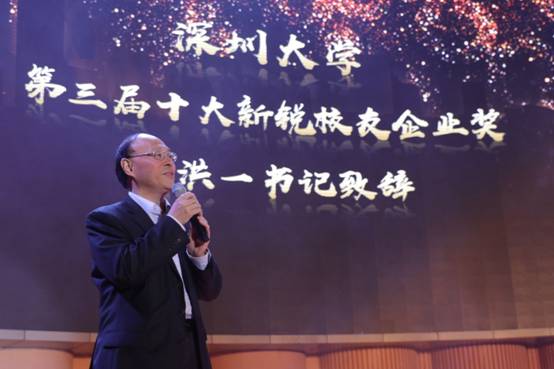 刘洪一在致辞中表示,很高兴见到了来自广东、北京、上海等来自全国各地的杰出校友。他说,一所大学办学成功的标志,最重要的便是能否培养出成千上万对社会有贡献、有社会责任心的校友。深大1983年建校以来的30多年里,培养了10多万优秀校友,为国家建设、深圳特区改革开放事业做出了巨大的贡献。学校高度重视校友文化建设,每一位校友都是深大精神的载体。《深圳大学文化创新发展纲要》中提出,要服务校友、凝聚校友、与校友携手同行,让深大成为每一位校友永恒的精神家园和坚强后盾。新锐校友企业评选活动能够把成功校友的奋斗经验传递给年轻的在校学生,使他们青出于蓝而胜于蓝,是一个非常有意义的活动。他诚挚地祝愿每一位校友在奋斗路上、在人生道路上走得踏实,越走越好。
