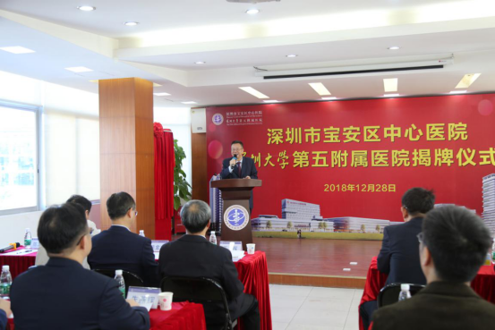 12月28日,深圳大学第五附属医院揭牌仪式在宝安中心医院举行。深圳大学副校长王晖,宝安区政府副区长周学良,宝安区卫计局局长杨北兵,医学部党委书记柴金龙,宝安中心医院党委书记、院长周华等领导参加了仪式。仪式由宝安区中心医院副书记兼纪委书记陈志宏主持。