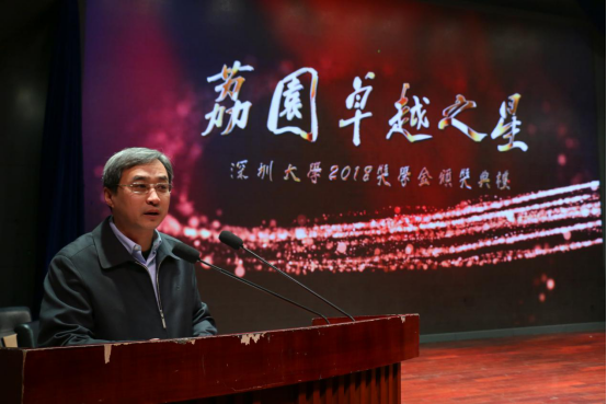 典礼开始,全场齐唱国歌。学生部副主任陈云飞介绍了深圳大学奖学金评定概况。今年是执行新奖学金评定办法的第二年,按照新的评定办法,除了奖励在某方面表现突出的单项奖,还增设了综合奖——“荔园之星”和“荔园卓越之星”,重点以学业成绩、创新创业成果、公共服务情况三个方面作为核心评价指标,突出了人才培养的综合导向。2018年奖学金评定工作的参与度高,今年我校有10462人网上申请了奖学金;奖学金的获奖面广,5841人获得学校各类优等生荣誉,125人获得各类社会奖学金,先进班集体165个,获奖比例达到28%;奖学金奖励力度大,今年发放各类奖学金共计1461.652万元。他表示,2018年我校在人才培养上取得了里程碑式的成绩,本科教育质量稳步提升,文理科录取分数稳居广东高校第四名。