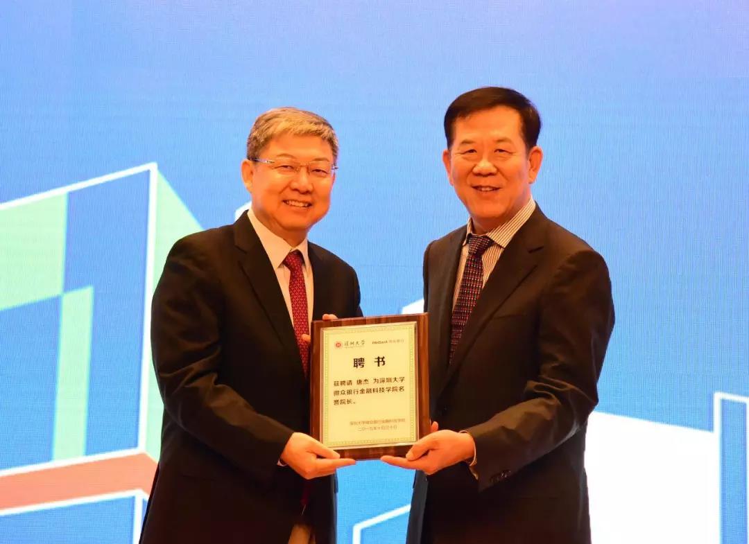 李清泉为唐杰教授颁发深圳大学微众银行金融科技学院名誉院长聘书