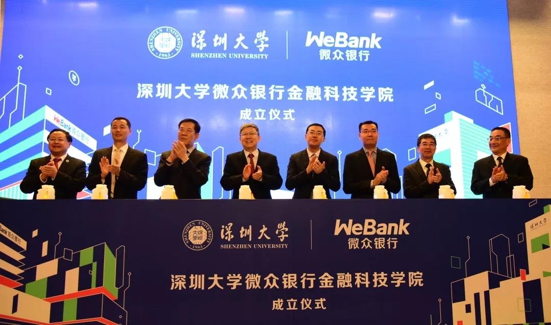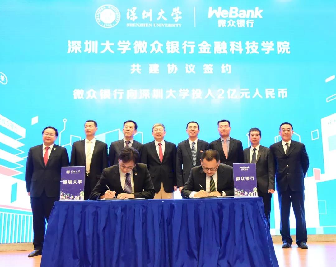 深圳前海微众银行股份有限公司向深圳大学捐赠一亿元人民币,用于支持深圳大学微众银行金融科技学院的建设发展和教学科研等。至此,微众银行本次共计出资两亿元人民币,用于和深圳大学开展全方位合作,主要致力于金融大数据技术应用、区块链金融、保险科技、监管科技等金融科技方面的合作。