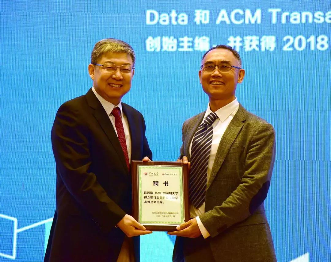 李清泉为杨强教授颁发深圳大学微众银行金融科技学院学术委员会主席聘书