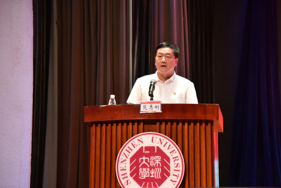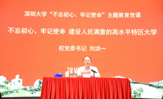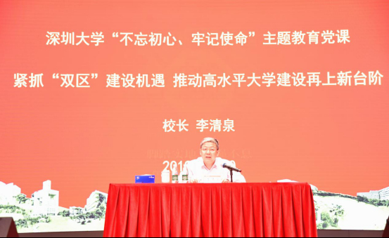 10月30日下午,我校在国际会议厅大厅举行“不忘初心、牢记使命”主题教育活动——书记、校长讲党课。校党委书记刘洪一和校长李清泉分别以《不忘初心、牢记使命,建设人民满意的高水平特区大学》和《紧抓“双区”建设机遇,推动高水平大学建设再上新台阶》为题讲了一堂生动的党课。活动由党委副书记范志刚主持,全体校领导以及全体中层干部、学校人事工作教授委员会和计划财务工作教授委员会主任、副主任等百余名深大教职工参加此次主题教育活动。