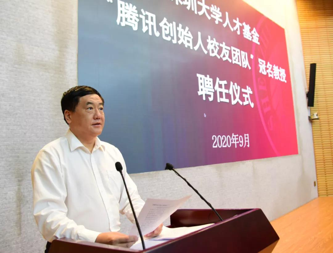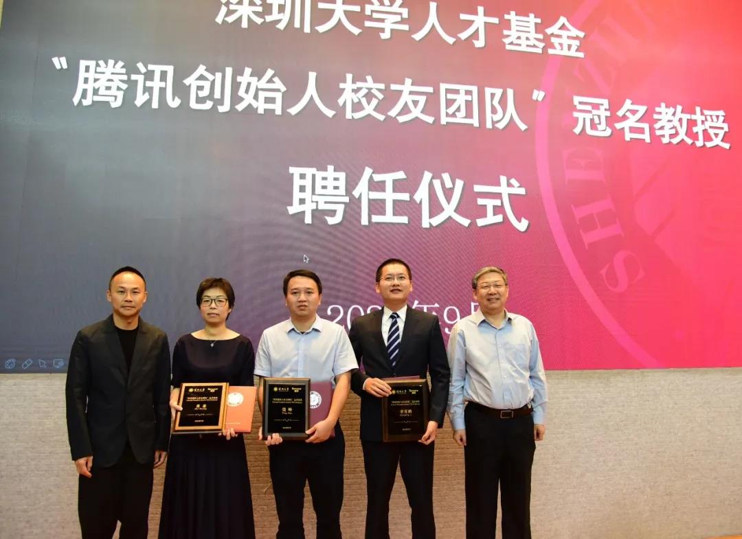 9月15日,深圳大学举行人才基金“腾讯创始人校友团队”冠名教授聘任仪式,首批聘请李霄鹏、饶峰、黄惠三位教授为“腾讯创始人校友团队”冠名教授(特聘),这标志着深圳大学冠名教授制度全面实施。深圳大学校长李清泉,深圳大学党委副书记、深圳大学教育发展基金会理事长范志刚出席仪式并致辞,腾讯创始人校友、深圳大学人才基金发起人马化腾、陈一丹分别通过视频致辞,腾讯副总裁谢晴华出席聘任仪式。