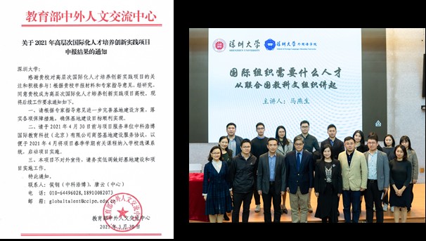 该基地获批以来,外国语学院作为主要依托单位,充分发挥国际化资源和学科专业优势,邀请“高层次国际化人才培养创新实践项目”专家组副组长马燕生公参亲赴我校举办《国际组织需要什么人才-从UNESCO谈起》主题讲座,深圳市外事办公室顾挺副主任一行14人出席。马燕生公参现场祝贺深圳大学正式获批教育部中外人文交流中心的高层次国际化人才培养创新实践项目,希望深圳市外办和深圳大学能够借此契机共建平台,为国家为社会为全人类培养一批能够从事国际组织工作的高层次人才。