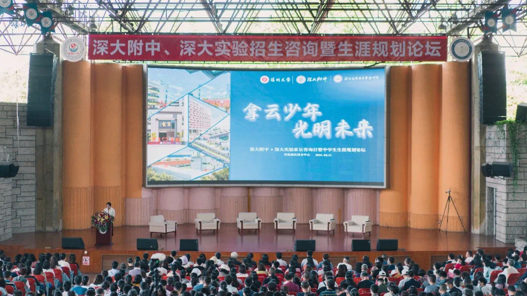 4月11日,深圳大学附属教育集团的两所中学——深圳大学附属中学和深圳大学附属实验学校共同在深圳大学粤海校区演会中心举办招生咨询暨生涯规划论坛。深圳大学党委副书记范志刚,中国工程院院士、深圳大学智慧城市研究院院长郭仁忠,深圳大学附属教育集团总校长、深大附中党委书记、校长刘为基及各相关单位的领导和老师出席了本次活动。参加本次活动的学生家长和各媒体记者共2000余人。