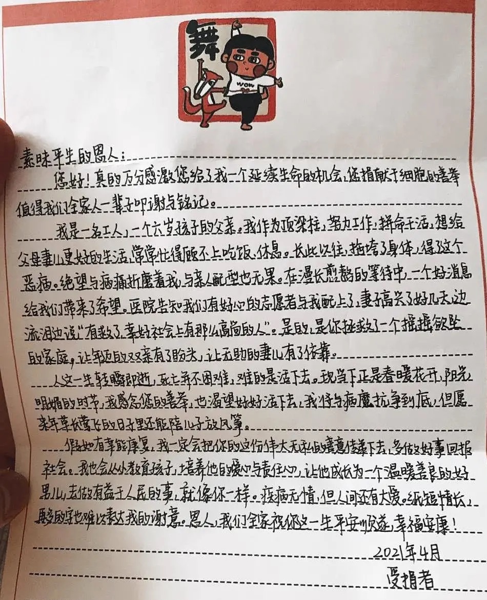 “人这一生转瞬即逝,死亡并不困难,难的是活下去。现当下正是春暖花开、阳光明媚的世界,我感念你的善举,也渴望好好活下去,我将与病魔抗争到底,但愿来年草长莺飞的日子里还能陪儿子放风筝。”