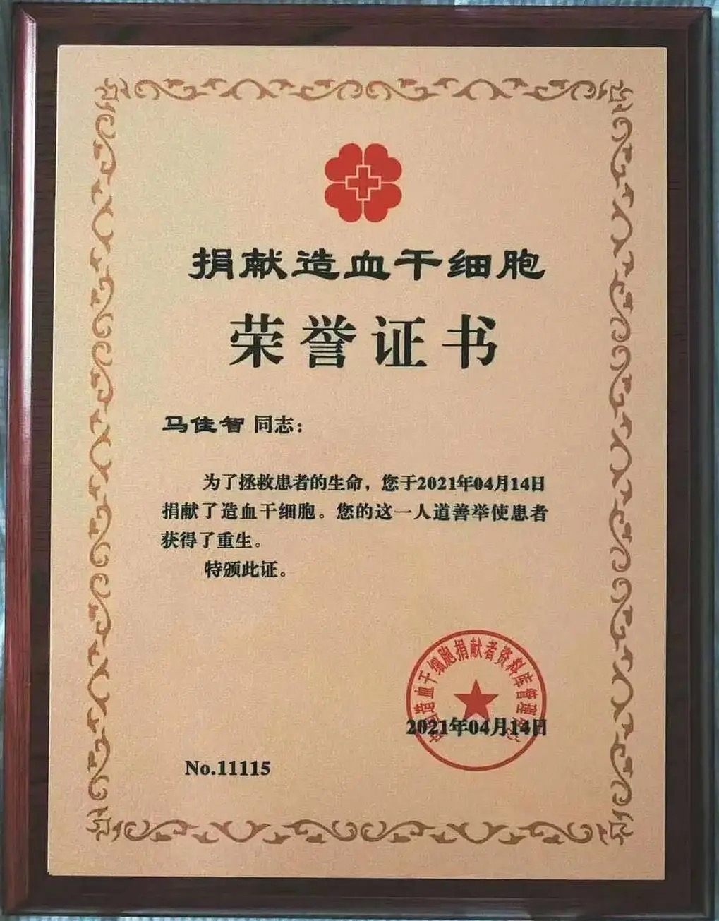 早在此前的献血活动中,马佳智就了解到了一些关于造血干细胞捐献的知识。当时的他出于本心签下了同意书,血型等信息也随之录入了中华骨髓库中。