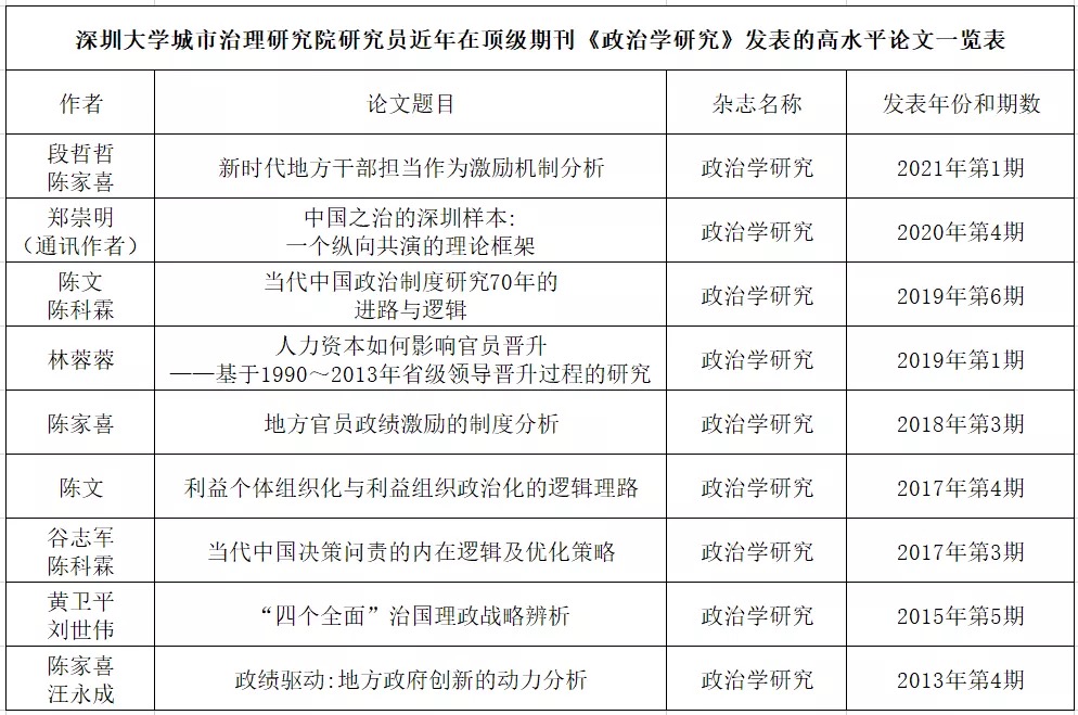 《政治学研究》(双月刊)为全国政治学专业顶级学术理论刊物,中国社会科学院主管,中国社会科学院政治学研究所主办。深圳大学城市治理研究院研究员近年来在该期刊上共连续发表论文9篇,这充分体现了我校政治学科在国内学术界的影响力和显示度。