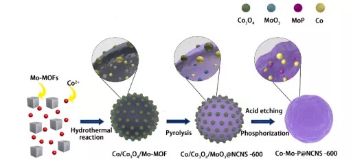 此工作详细地介绍一种通过后改性的合成策略制备由Co和MoP嵌在氮掺杂碳纳米球 (Co-Mo-P@NCNS)的金属-掺杂TMP催化材料。通过一系列的表征详细地分析物相的存在形式以及结构设计的合理性。此外,通过一系列的电化学测试证明该材料具有优异的催化性能。析氧反应的过电势为270 mV,析氢反应的过电势为62 mV。当Co-Mo-P@NCNS用于水全解装置时,它能在10 mA cm-2的电流密度下仅需要1.58 V的低电位,并能持续运行38000秒(105.6小时)表现出优异的稳定性。