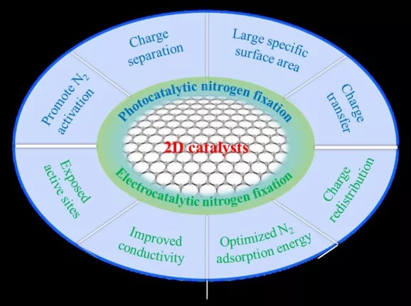 利用丰富的N2、H2O以及可再生的太阳能和电能合成NH3,使光催化和电催化N2还原反应(N2RR)得以在非常温和的反应条件下进行。2D催化剂,由于其独特的物理、化学和电子性质,已成为N2RR的明星材料。与体相催化剂相比,2D催化剂通常具有更短的光生载流子扩散路径、更高的比表面积和导电性、更多的空位型缺陷和暴露的边缘位点,从而有利于光生载流子的分离和N2分子的吸附活化。