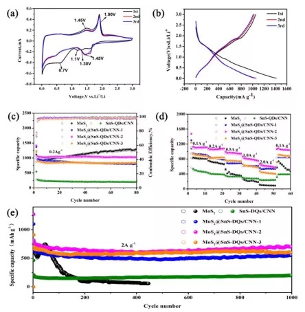 此工作详细地介绍一种大规模可控的方法合成了超薄MoS2纳米片锚定在含SnS量子点的三维分级碳纳米框架上(MoS2@SnS- QDs/CNN)。通过一系列的电化学测试证明该材料具有优异的循环稳定性。作为半电池阳极材料,MoS2@SnS- QDs/CNN-2在2A·g-1的电流密度下经过1000次循环后,提供了713 mAh·g-1的可逆容量。当组装成全电池时,它在100次循环后仍能提供491 mAh·g-1的电流密度。最后,通过原位XRD,非原位XPS详细地分析了MoS2@SnS- QDs/CNN-2在嵌脱锂过程中的物相变化机理。这项工作为设计相关的能量储存和转换系统提供了一个有前途的策略,在其他应用中也有很大的潜力,如超级电容器、催化和传感器。