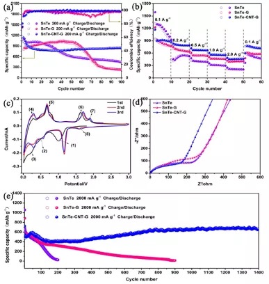 此工作详细地介绍了通过可扩展球磨法将拓扑绝缘体SnTe和碳纳米管负载在石墨碳框架上(SnTe-CNT-G),作为一种新型、活性、坚固的高倍率锂离子电池负极材料的制备方法。通过一系列的表征详细地分析物相的存在形式以及结构设计的合理性。SnTe-CNT-G复合材料在200 mA g-1的电流密度下循环100次后提供了840 mAh g-1的优异可逆容量和76.0%的高初始库仑效率,并在2000 mA g-1的高电流密度下循环1400次后仍展现出669 mAh g-1的循环稳定性。