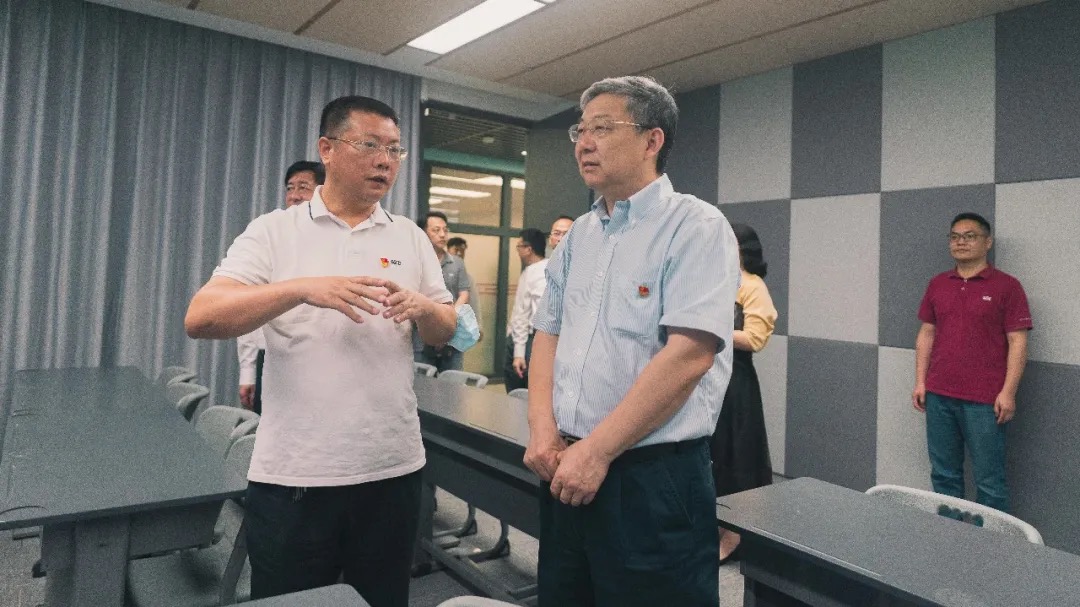 随后,李清泉一行来到沧海校区致理楼。王志强介绍,用于日常教学的主要有演示型智慧教室、录播型智慧教室、远程互动型智慧教室等。这一类教室采用“1个主教室+3个听课教室+多个旁听教室”的模式,主讲教室既可以独立上课,也可以与其他教室进行实时互动。与传统教室的陈设相比,分组研讨智慧教室重构了教学空间,加入了智能设备。室内可见不规则样式的桌子分组摆放,配备万向轮的多功能椅子围桌陈列,两面华为智慧屏代替了黑板。“老师会把录播的课程放到云端,并制作知识点标签,课后同学们可以随时下载学习,巩固知识。”王志强说,“老师们也可以通过观看自己的录播课程,改进教学方法。”