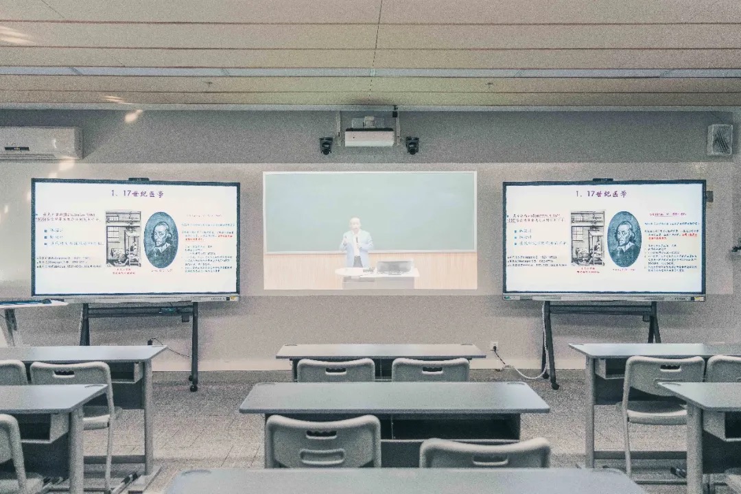 远程互动型智慧教室分为主讲教室、听讲教室和旁听教室。位于汇紫楼A101的主讲教室是一个半圆环形阶梯教室,左右两边各有两个投影仪,除面对现场听课的学生外,讲座还于粤海、沧海和丽湖三校区同时直播与互动,实现了跨校区教学。李强教授的《精准医学》讲座覆盖了600多名学生,远超传统课堂学生规模。听讲教室设有多屏互动系统,上课时讲台主屏显示主讲教室老师讲课画面,两边的辅屏可显示课件内容,每间听讲教室搭载两面辅屏,方便同学们观看课件;当主讲老师切换为对话模式时,辅屏切换为听讲教室情景,实现主讲教师与听讲教室学生的远程互动,主讲人还可通过讲台地面上的监视器看到其他校区听讲教室的情况,及时掌握授课效果。