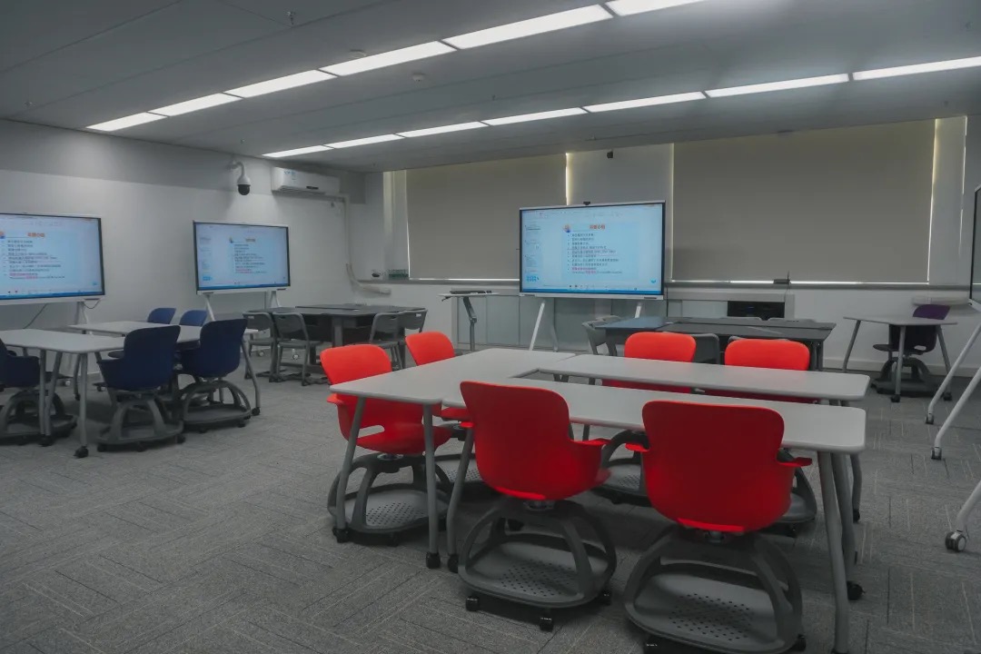 此外,我校还设置了分组研讨型智慧教室,以适用不同的教学场景。分组研讨型智慧教室不设立讲台,强调互联互通、课堂可视化与“沉浸式”教学,旨在突出师生课堂互动分享。师生可以通过多媒体互联系统,实现课堂演示的大屏、多屏、多视窗分享,满足小组研讨、分享、教师批注等教学需要。这种新型教室打破了传统单向传输的教学模式,拉进了老师与学生之间的距离,增强了与学生的交互性。在现场,李清泉等校领导率先感受“智慧教室”小组研讨氛围,切实体会到了师生交流“零距离”。