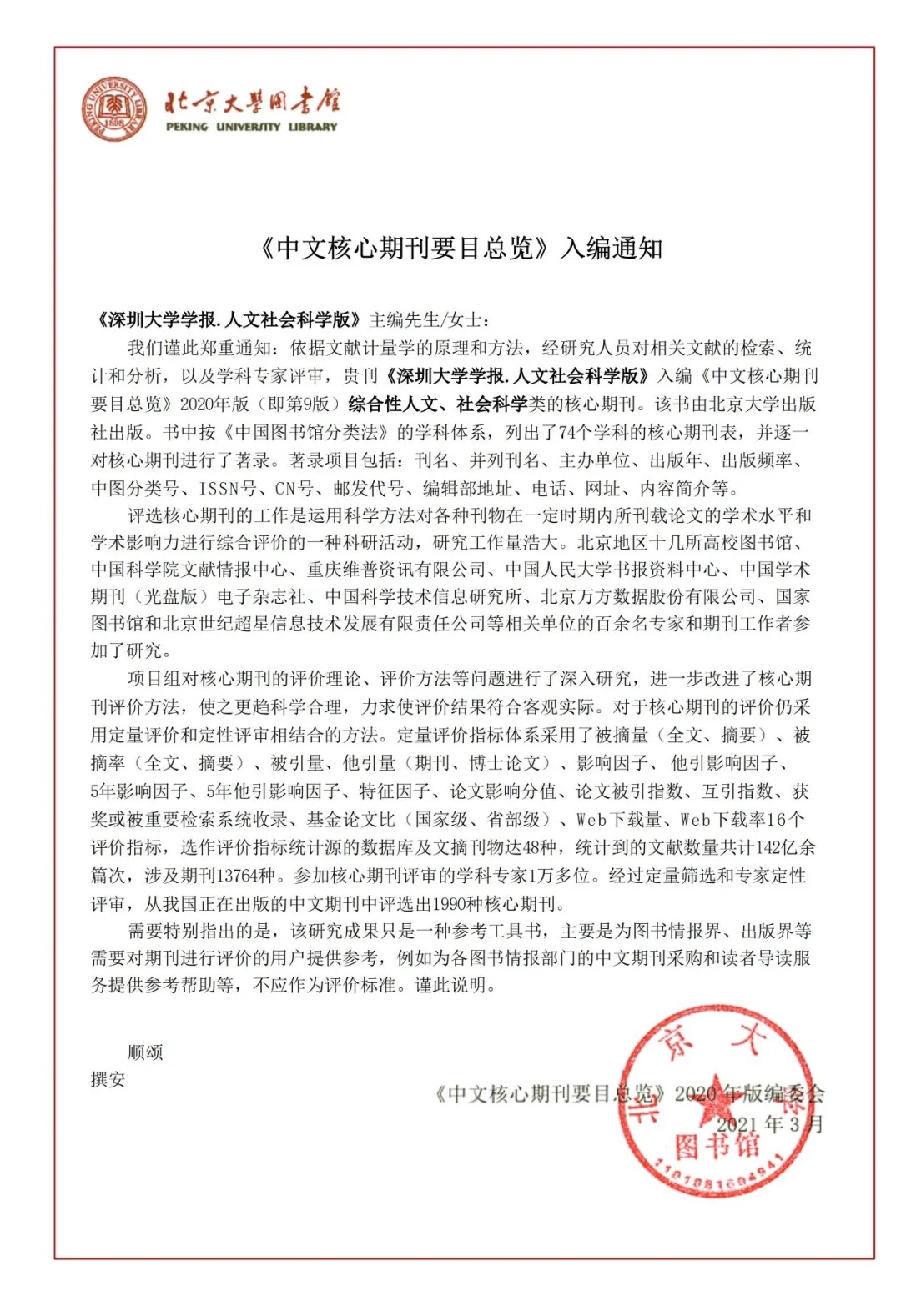 此前,2021年3月,北京大学图书馆《中文核心期刊要目总览》编委会发布,《深圳大学学报(人文社科版)》入选《中文核心期刊要目总览》2020年版(即第9版)综合性人文、社会科学类的核心期刊。