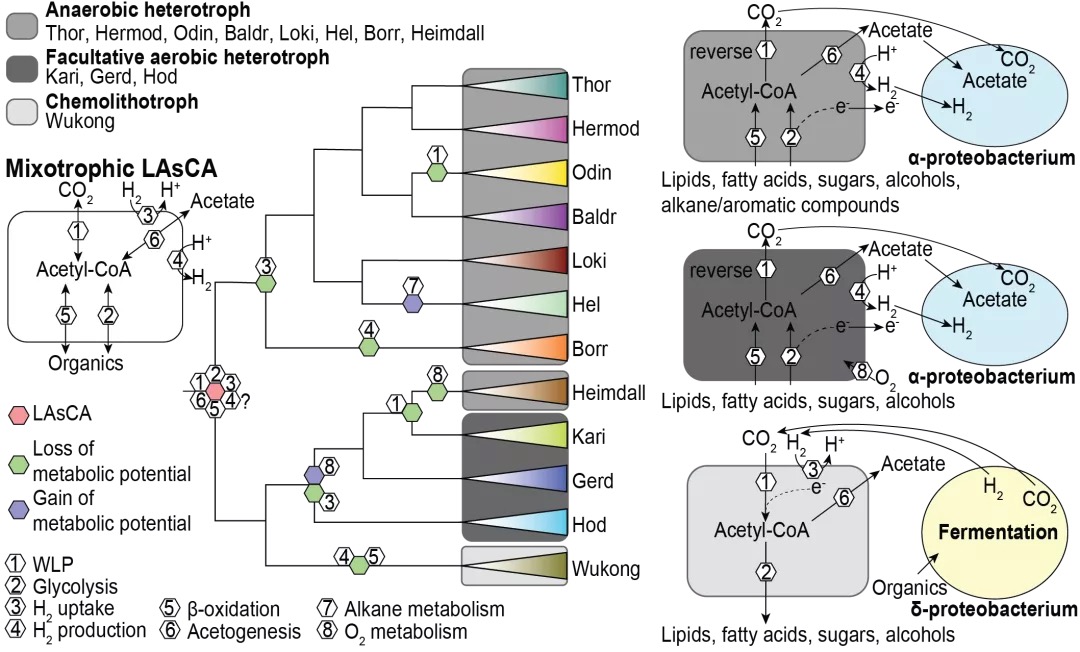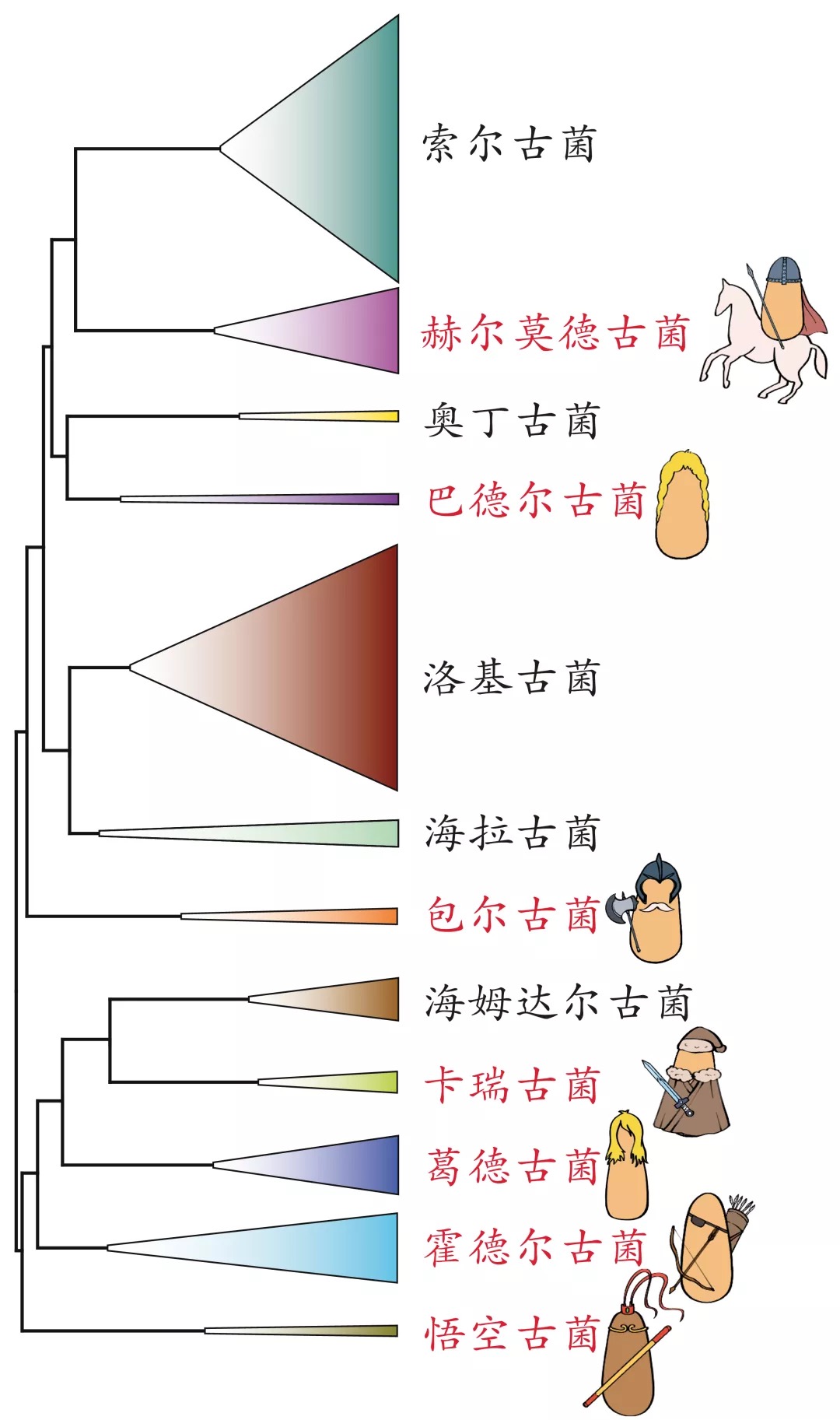 在此基础上,李猛教授课题组与Eugene Koonin教授课题组等开展深入合作,对现有基因组和不同环境样品的宏基因组进行整合分析,获得了162个高质量的阿斯加德古菌基因组,其中75个属于尚未报道的新基因组,从中发现了6个尚未被报道的阿斯加德古菌新门,其中5个门类分别以北欧神话的神命名为赫尔莫德古菌(Hermodarchaeota,赫尔莫德:神使)、巴德尔古菌(Baldrarchaeota,巴德尔:光明之神)、霍德尔古菌(Hodarchaeota,霍德尔:黑暗之神)、包尔古菌(Borrarchaeota,包尔:奥丁的父亲)和卡瑞古菌(Kariarchaeota,卡瑞:风之神),还有一个更为古老的阿斯加德古菌新分支则以中国古典名著《西游记》中大闹天宫的齐天大圣“孙悟空”的名字命名为悟空古菌(Wukongarchaeota),以彰显我国文化自信。分析表明,悟空古菌具备氢氧化的化能自养代谢潜能,显著区别于其他阿斯加德古菌混合营养或异养的代谢模式,这也是将其命名为中国神话人物的原因。