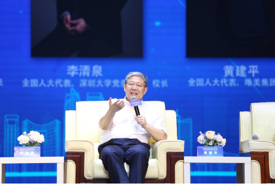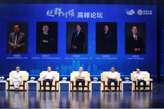 “链群对接”高峰论坛上,李清泉与东莞理工学院党委副书记李忠红,东莞市技师学院院长刘海光,全国人大代表、唯美集团董事长黄建平,东莞市政协常委、民盟东莞市委会副主委、广东宏川集团有限公司董事长林海川等院校专家和企业家代表,围绕深化产教融合、强化校企合作展开深度对话,为东莞如何更好地开展校企合作、实现精准对接建言献策。李清泉表示,校企合作是高校人才培养的重要助力,深圳大学在校企协同培养方面已有不少颇具成效的实践探索,希望未来政府、院校、企业等多方形成合力,营造校企合作的共赢局面。
