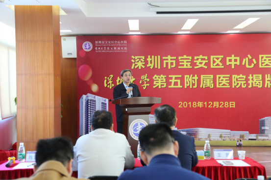 12月28日,深圳大学第五附属医院揭牌仪式在宝安中心医院举行。深圳大学副校长王晖,宝安区政府副区长周学良,宝安区卫计局局长杨北兵,医学部党委书记柴金龙,宝安中心医院党委书记、院长周华等领导参加了仪式。仪式由宝安区中心医院副书记兼纪委书记陈志宏主持。