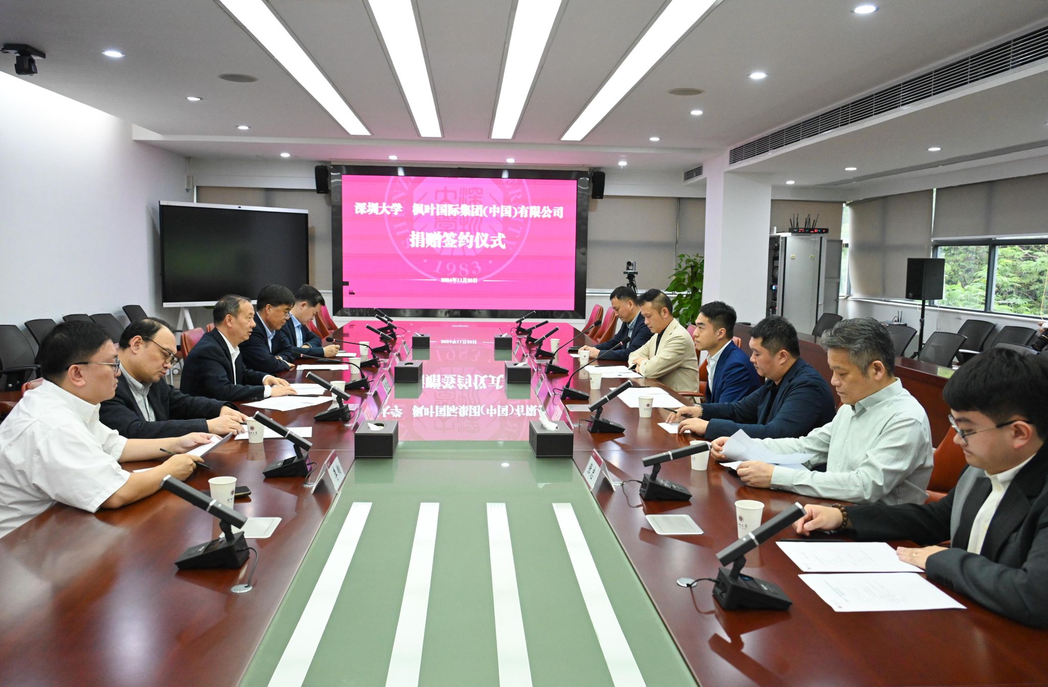 11月20日下午,深圳大学-枫叶国际集团(中国)有限公司捐赠签约仪式在深圳大学粤海校区汇元楼201会议室举行。深圳大学校长、中国科学院院士毛军发,深圳大学副校长汪永成;枫叶国际集团(中国)有限公司执行董事吴卓轩、顾问周子然、副总裁郭景昆出席签约仪式。汪永成主持签约仪式。