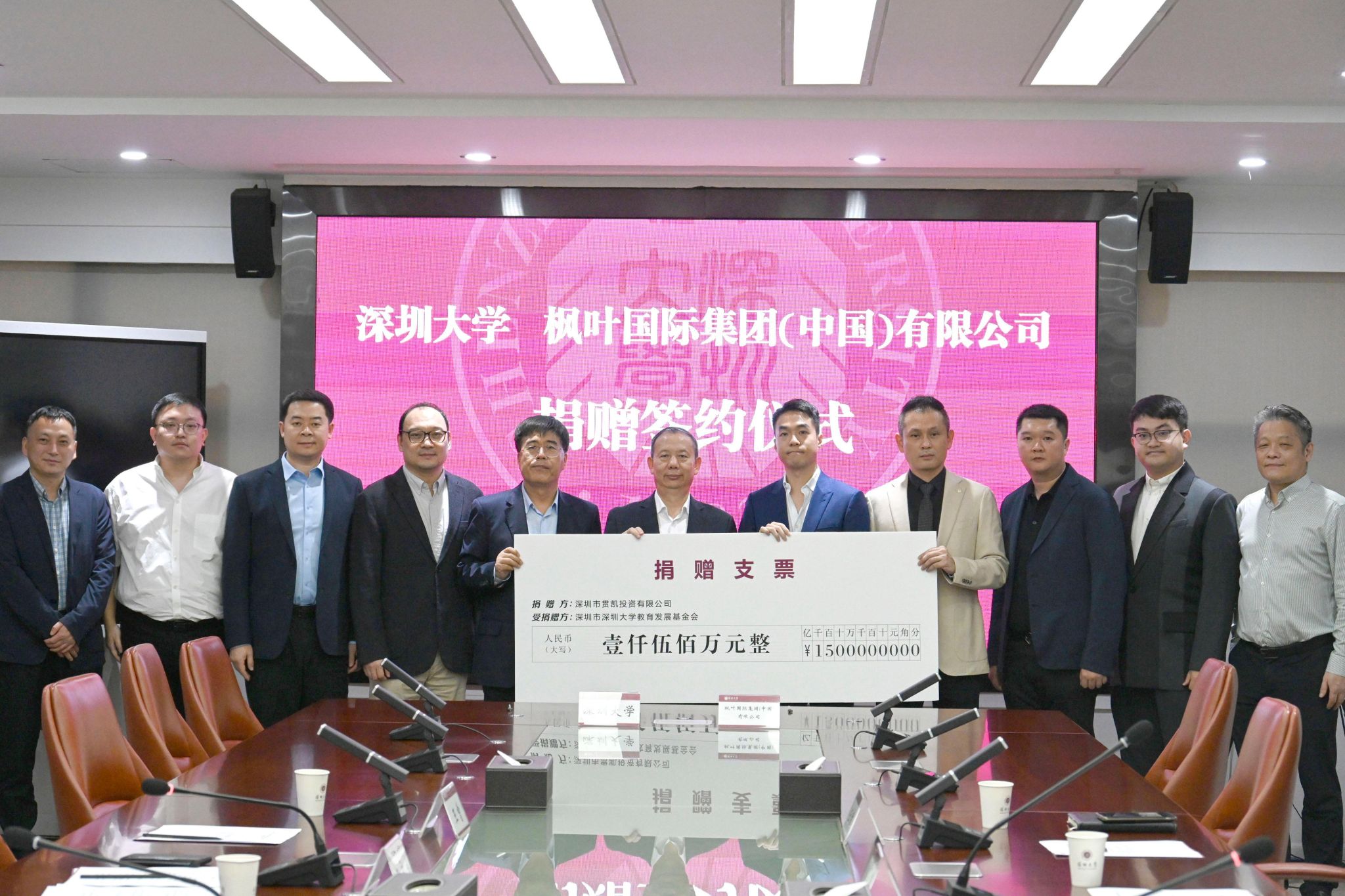 仪式上,汪永成和郭景昆分别代表深圳大学与枫叶国际集团(中国)有限公司签订捐赠协议,毛军发和吴卓轩共同见证签约。深圳大学党政办公室、教务部、校友联络部、校董会、高等研究院相关负责人,枫叶国际集团(中国)有限公司财务、商置运营负责人出席并共同见证签约。